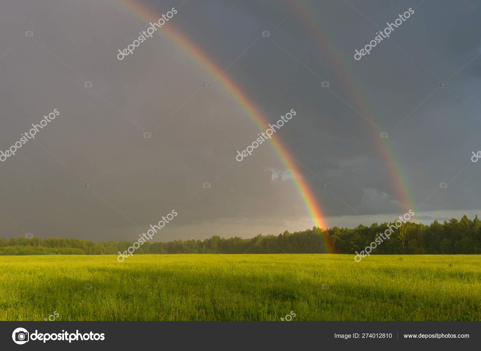 Wunderschone Landschaft Mit Dramatischem Himmel Und Doppeltem Regenbogen Grune Wiese Unter Bewolktem Himmel Mit Doppeltem Regenbogen Stockfoto C Katuka 274012810